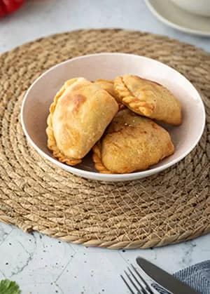Delectable deep fried golden pastries stuffed with a filling of spiced potatoes, peas, carrots and cauliflower.